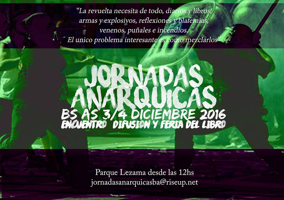Las Jornadas Anárquicas de Buenos Aires pretenden ser una instancia para la difusión de las ideas y el aprendizaje, un lugar de encuentro y debate, de ocio y fraternidad, donde se puedan plantear diferentes ideas y practicas acerca de la anarquía, la libertad, y la lucha contra toda forma de autoridad. Estas jornadas son la continuación de la feria del libro anarquista de Buenos Aires organizada en los años anteriores, decidimos cambiar el concepto porque queremos enfatizar en el encuentro y las diversas formas de propagar la anarquía.